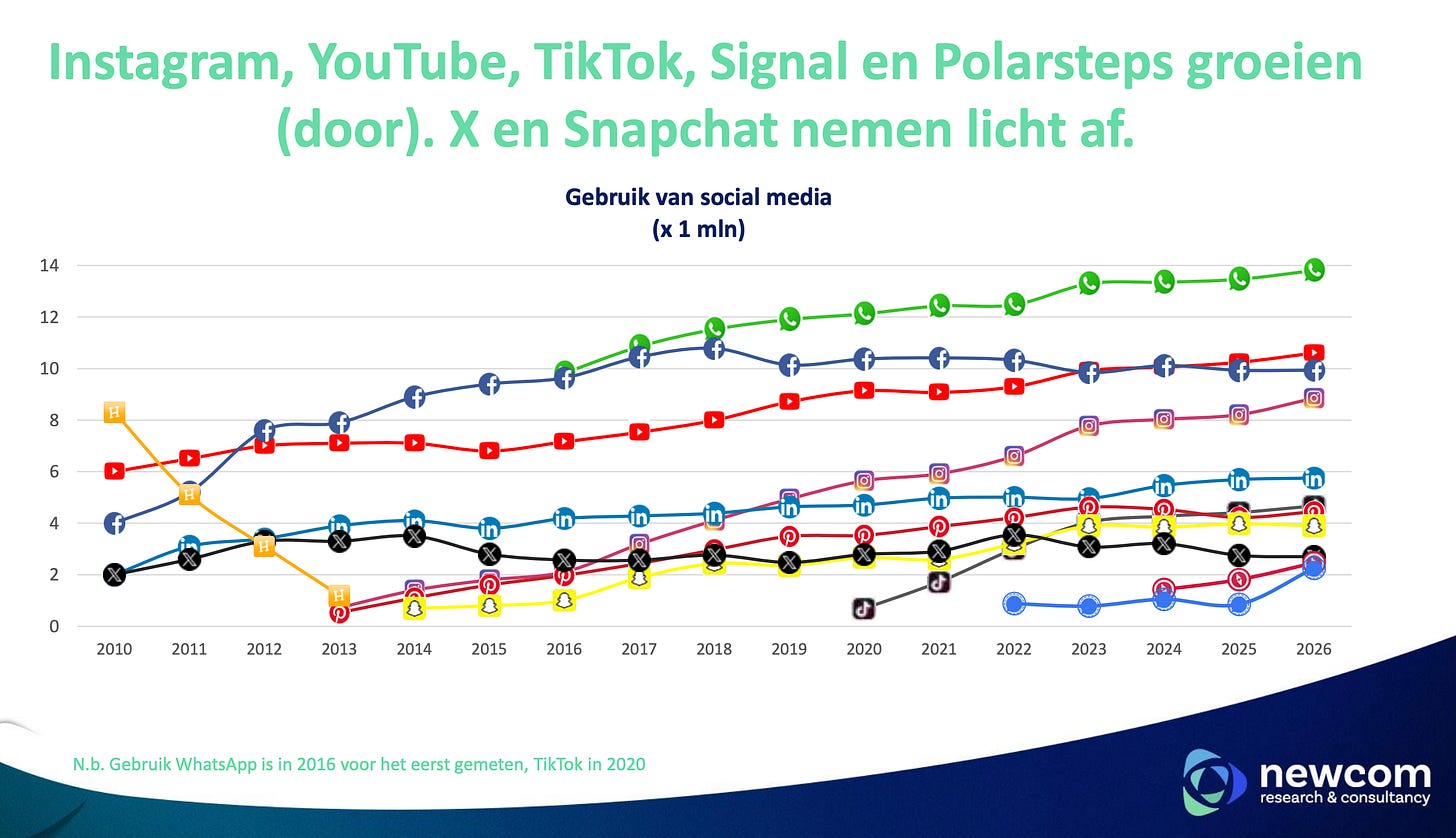Newcom publiceerde hun jaarlijkse onderzoek naar social media gebruik in Nederland. Voor het tweede jaar op rij is YouTube het grootste kanaal, als we berichten-apps als WhatsApp met 13,8 miljoen en Signal met 2,3 miljoen gebruikers in Nederland niet meetellen.